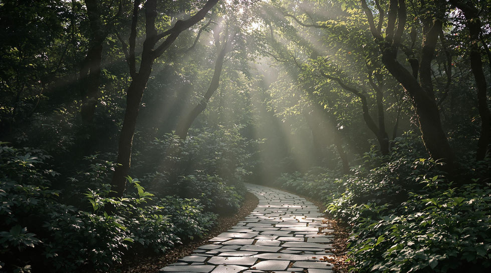 A whimsical residential landscape blending natural woodland features with curated design elements. Highlights include shaded pathways, a stone seating area, diverse native planting, and soft, moonlit lighting that evokes a magical atmosphere.